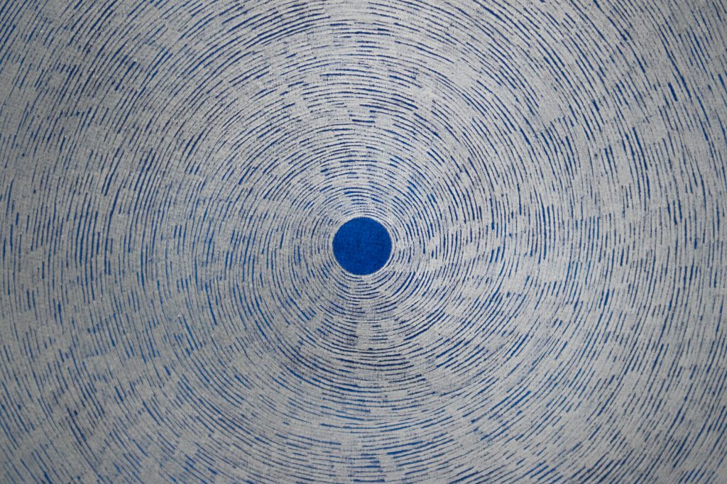 Le traitement du dessin en lui-même renvoie à l’idée de l’eau. Les textures jouent avec la lumière en donnant du mouvement aux lignes et aux traits. Travaillées pour certains en deux temps, les formes ancrées aux teintes bleues profondes se laissent deviner à travers un maillage aux reflets d’argent, qui interagit avec la lumière. Le dégradé découle à partir des points de rencontre entre les deux formes symétriques et intensifie ce mouvement. Les reflets varient en passant des teintes argentées aux dorées voire cuivrées suivant le point de vue, rappelant ainsi l’iconographie traditionnelle des lieux de culte.
