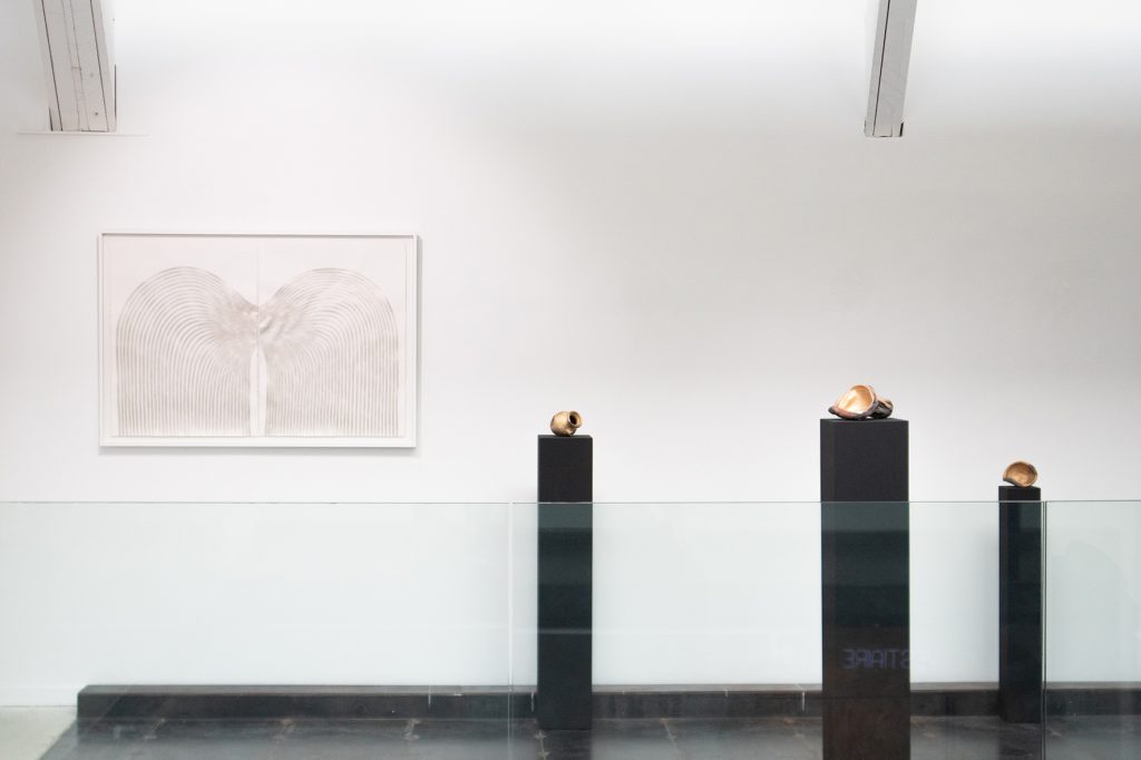 Les formes doubles soulignées par deux formats qui composent chacun des dessins renvoient aux références multiples. D’une part inspirés par les vaisselles cycladiques doubles, activé lors des rites, tels que le kandila, un contenant de liquides en marbre, suspendu par quatre tenons percés. D’autre part la dualité des volumes, se réfère aux bénitiers des églises, majoritairement baroques, créés à partir d’une forme de coquille, ou utilisant directement la coque de l’animal bivalve tridacne géant, en guise du contenant d’eau bénite. Une partie de la recherche attire l’attention vers cette forme double d’une coquille ouverte, qui symbolise la complémentarité, l’équilibre et l’union.